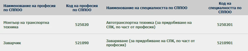 - Обучение по професия "Водач на МПС за обществен превоз", специалност "Вътрешни и международни превози на товари"