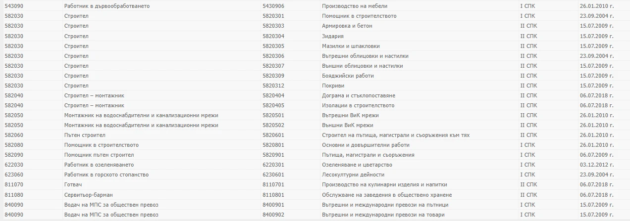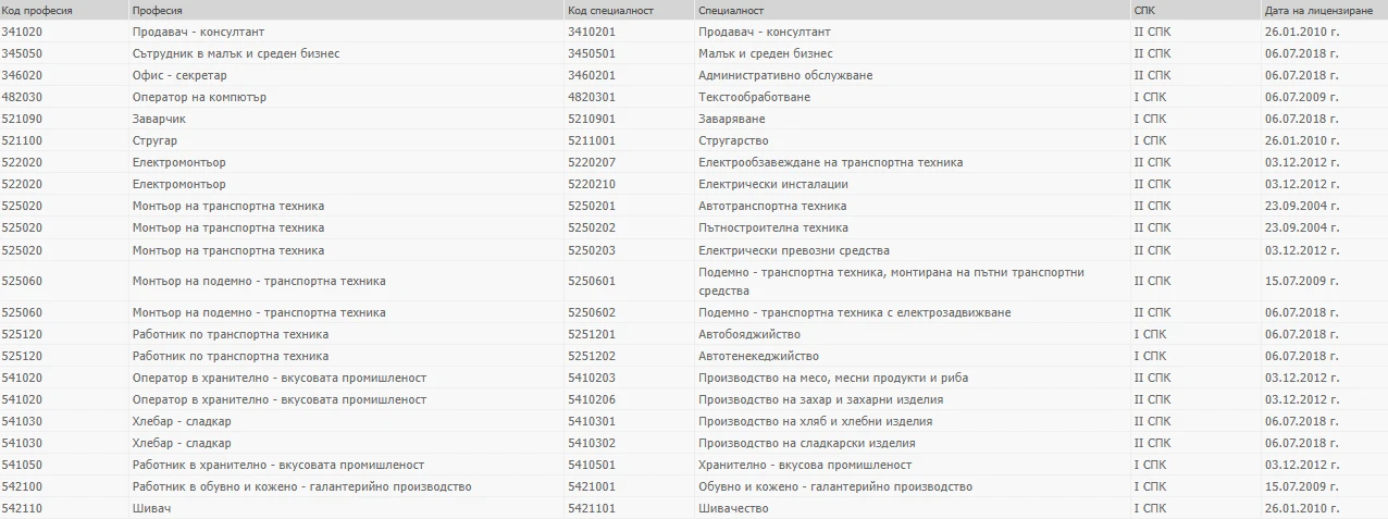 До 2025 г. са проведени обучения по следните професии и специалности: